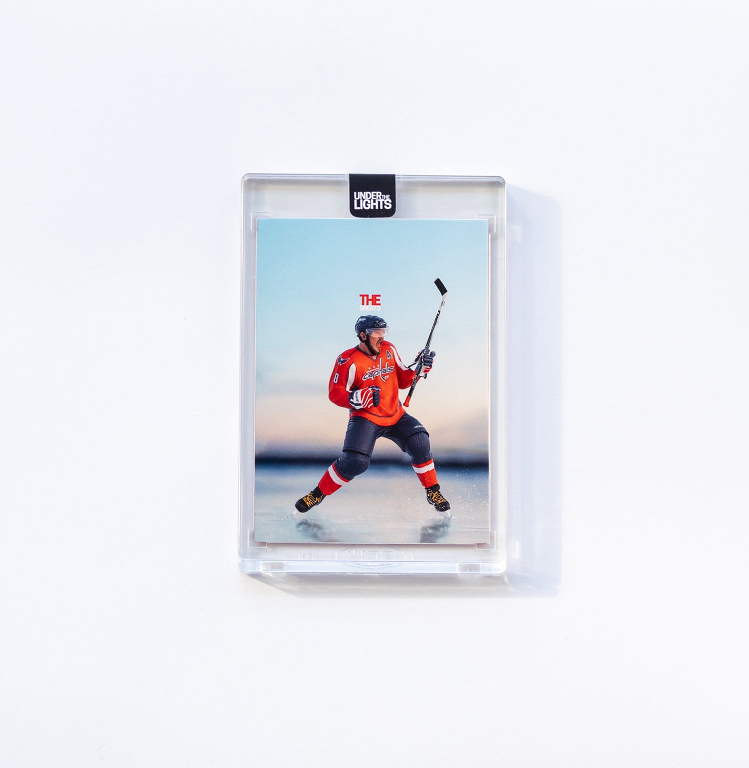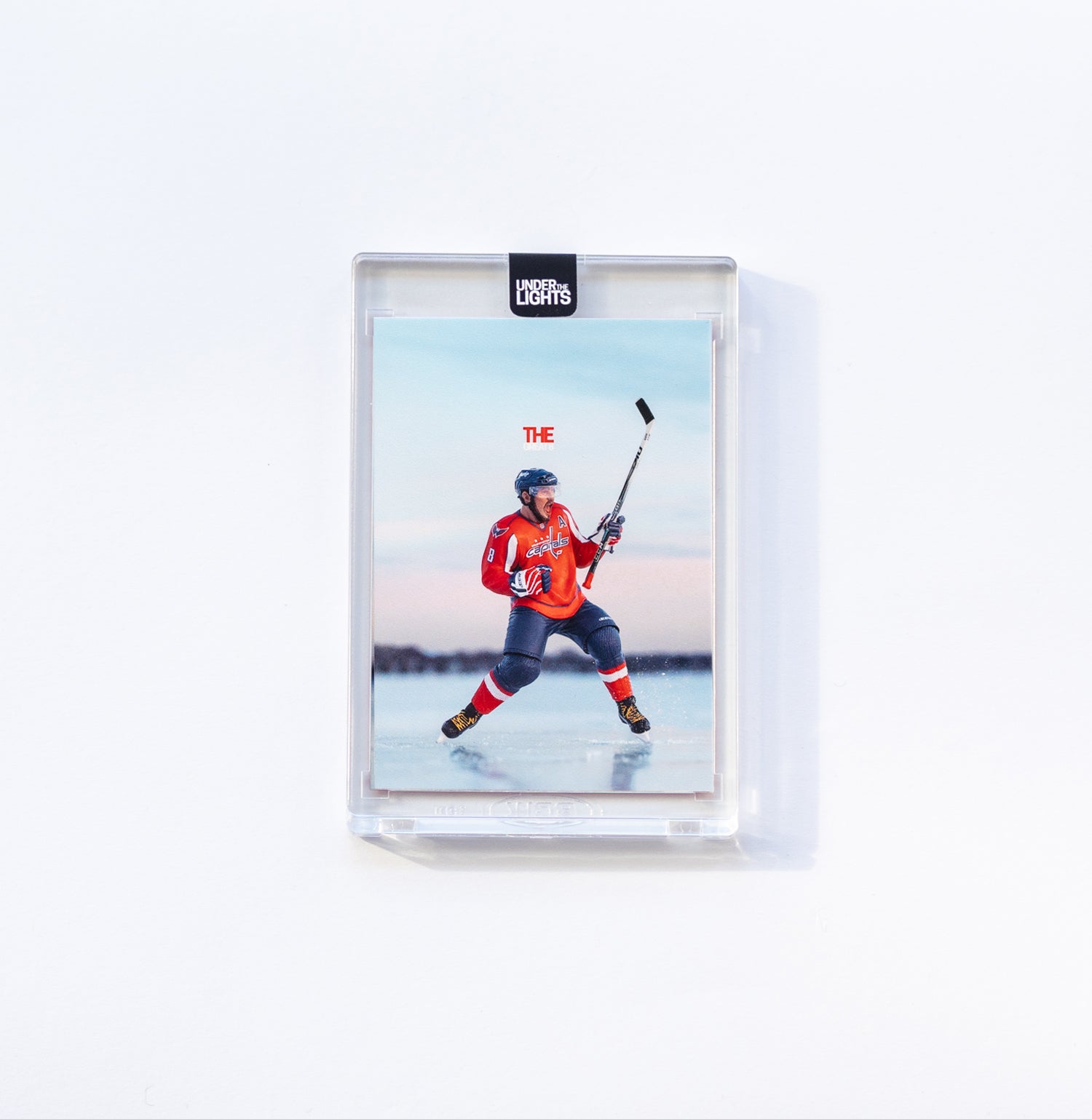 2026 Under the Lights Original art card of a mini Alexander Ovechkin figurine made by Mcfarlane. The “Pond Collection” reimagines NHL pond hockey on an actual frozen lake.