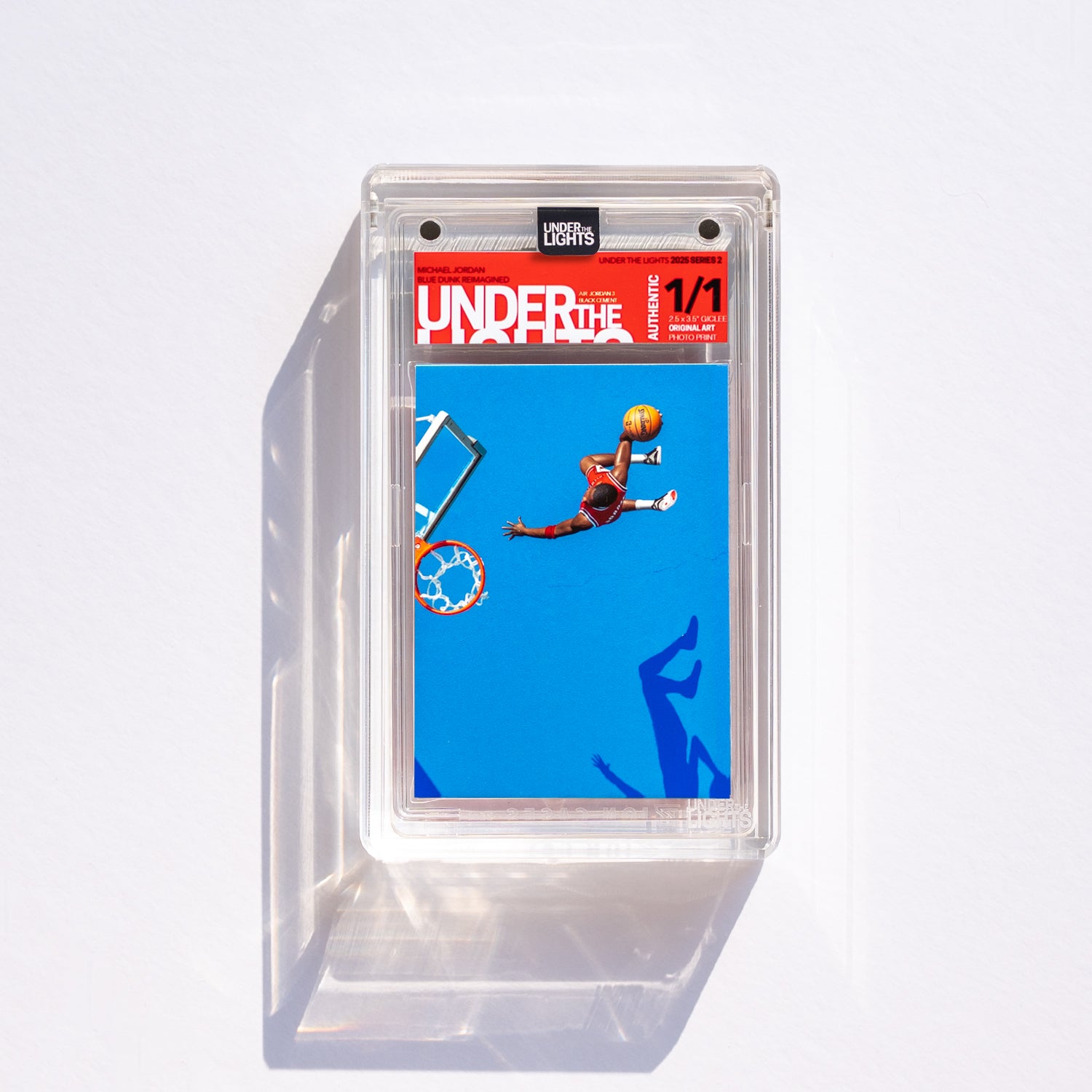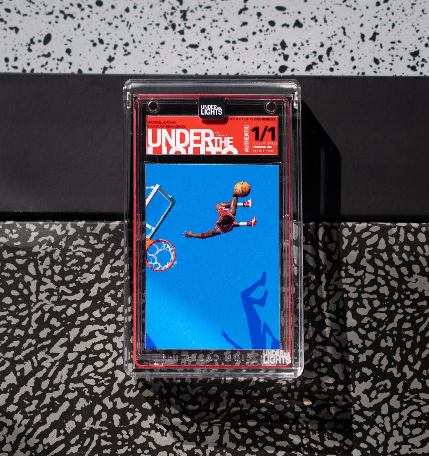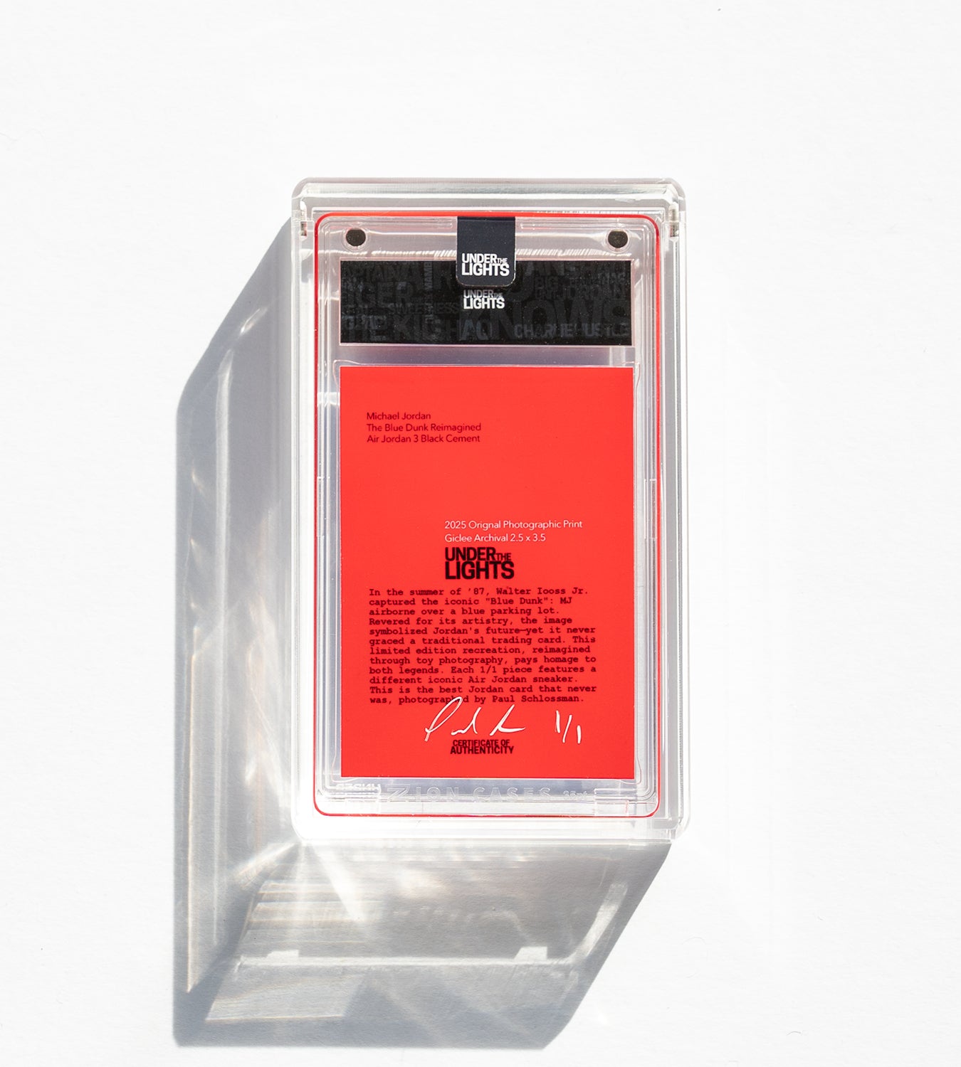 Remarkably, the photo never graced a traditional trading card. So, Under the Lights recreated it using a toy figurine. Each piece is 1/1 and features a different iconic Air Jordan sneaker. This is the "Best Jordan card that never was," brought to life by Under the Lights. Created by Paul Schlossman.