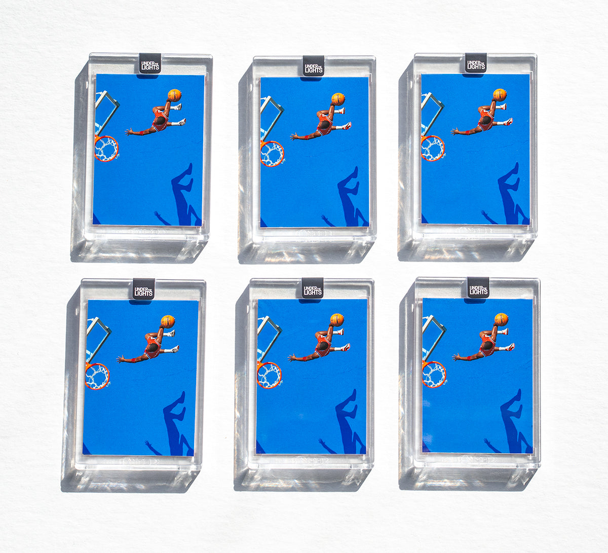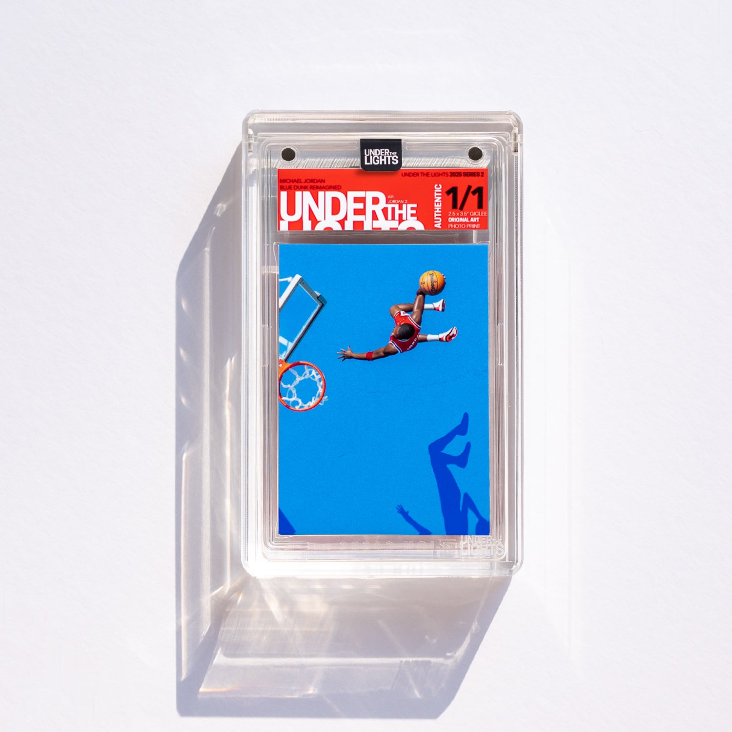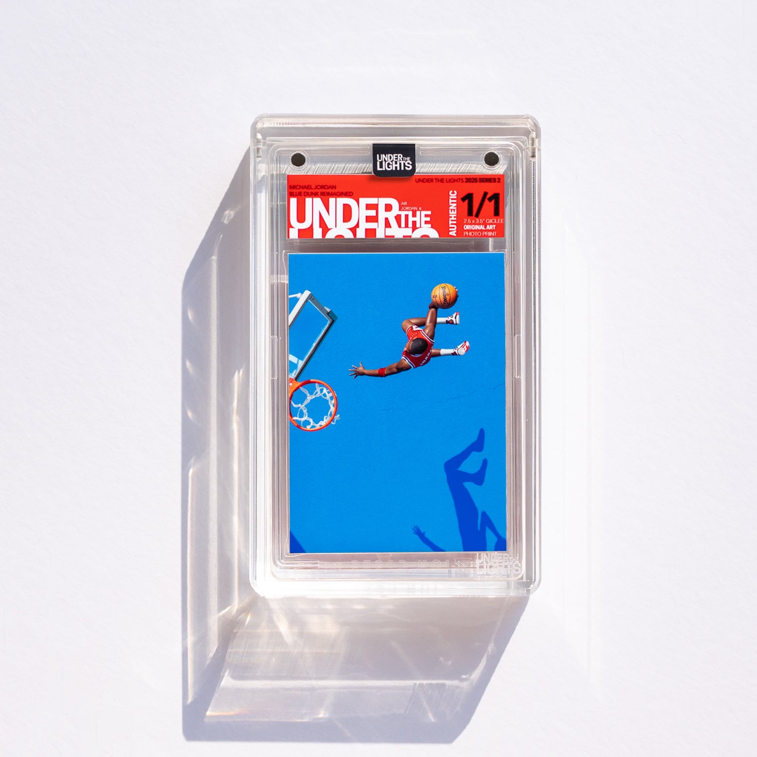 Remarkably, the photo never graced a traditional trading card. So, Under the Lights recreated it using a toy figurine. Each piece is 1/1 and features a different iconic Air Jordan sneaker. This is the "Best Jordan card that never was," brought to life by Under the Lights. Created by Paul Schlossman.