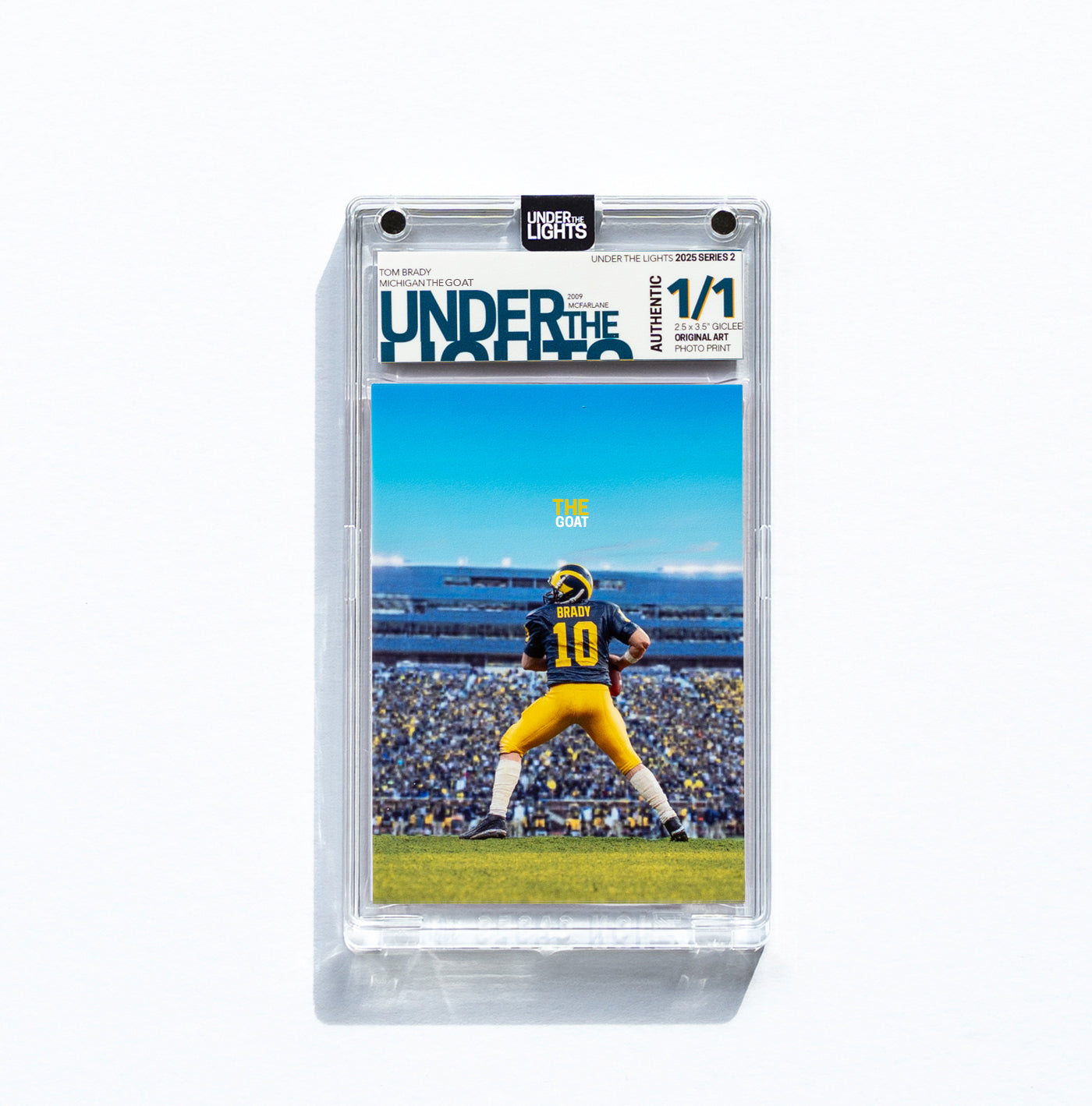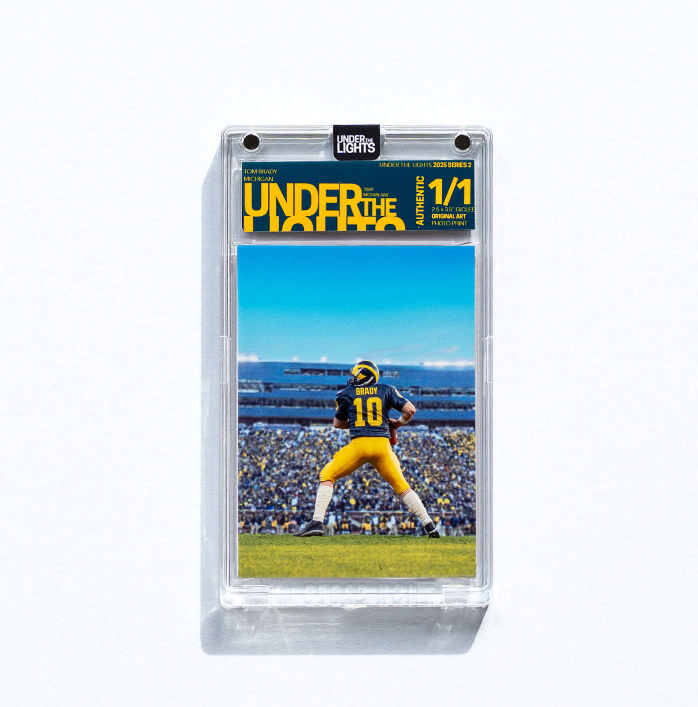 2025 Under the Lights Original Art Card of a Tom Brady figurine playing under the lights at Michigan Stadium.