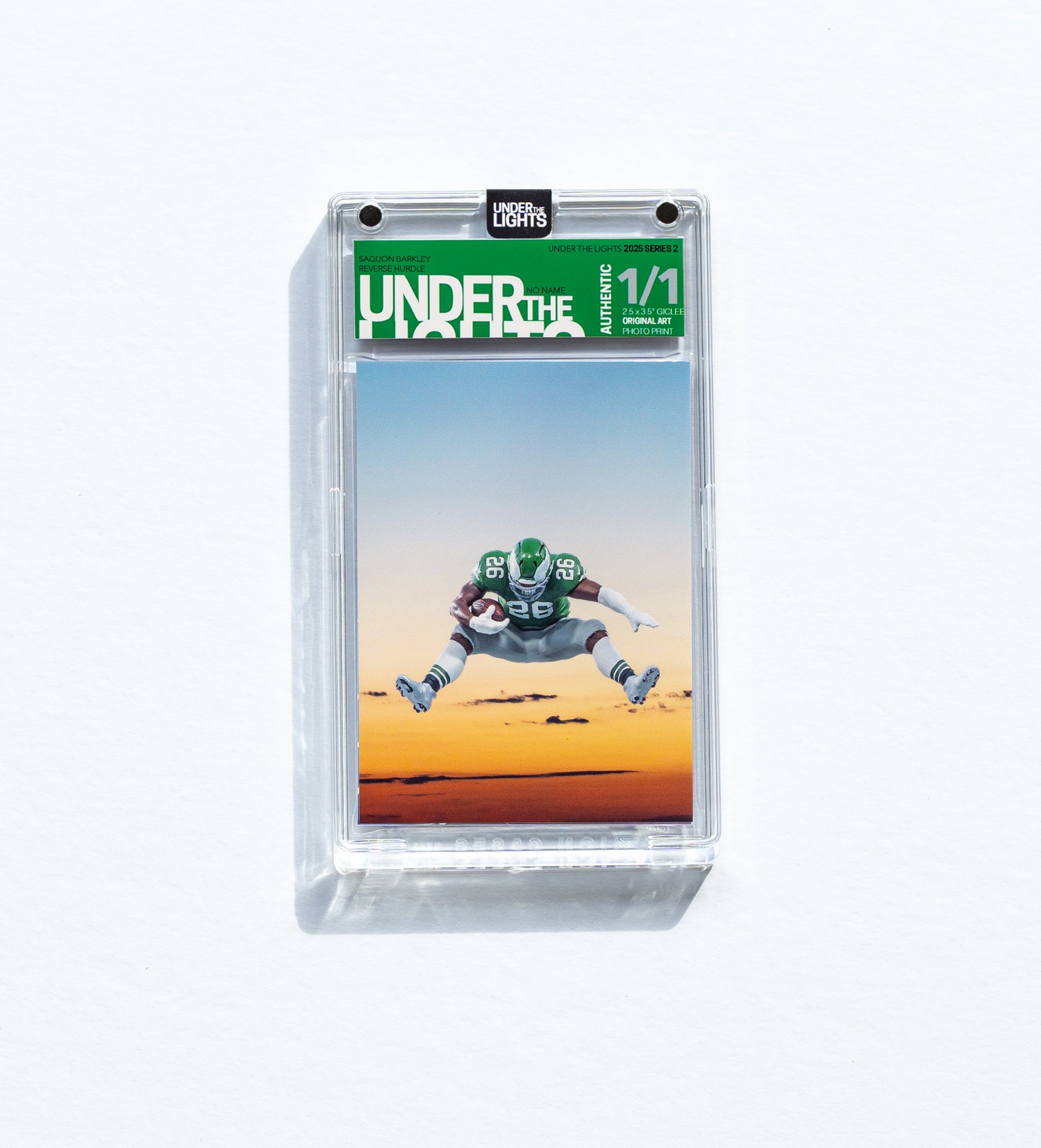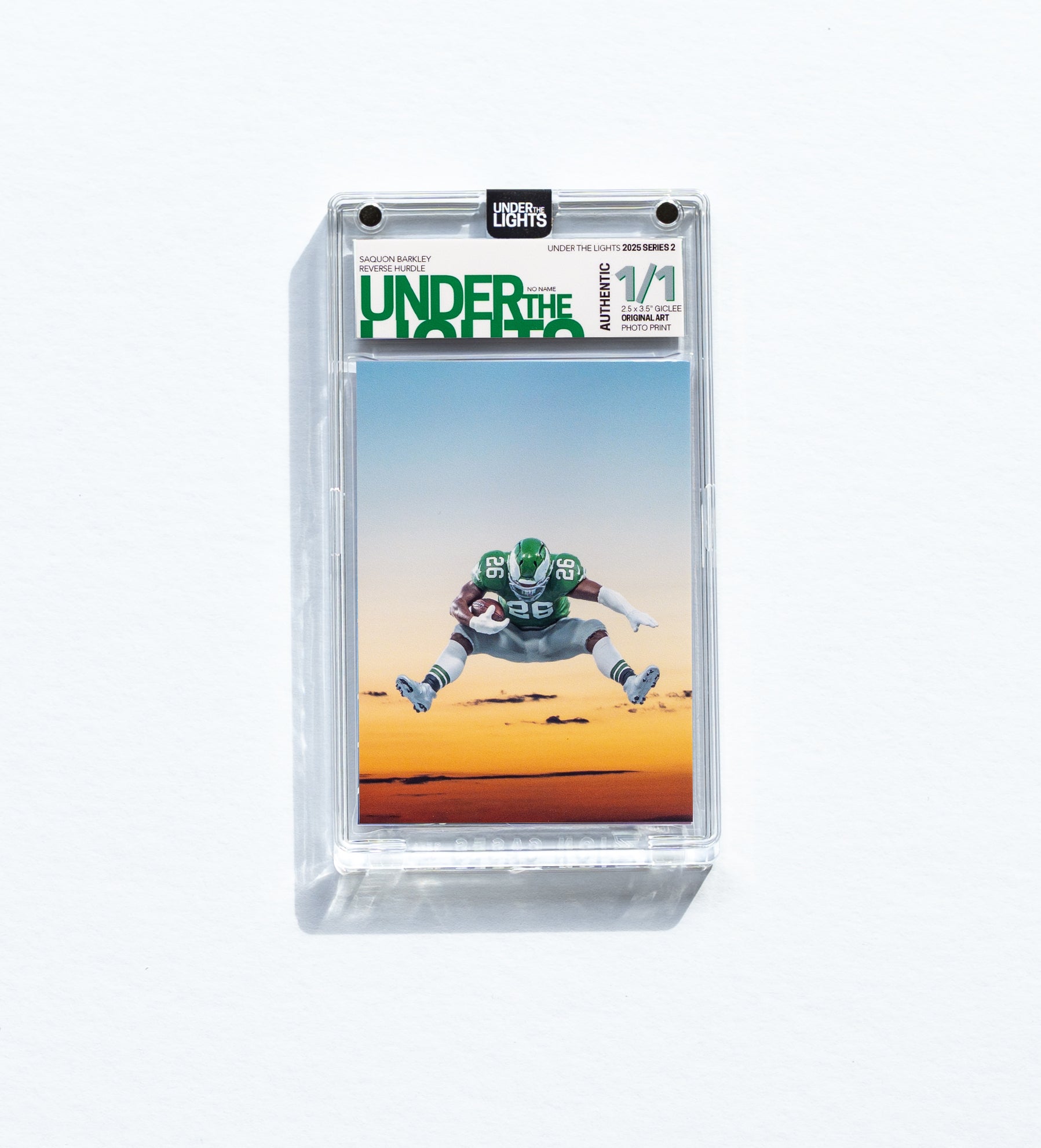 2025 Under the Lights art card of a Saquon Barkley 3D printed figurine recreating the iconic reverse hurdle from 2024.