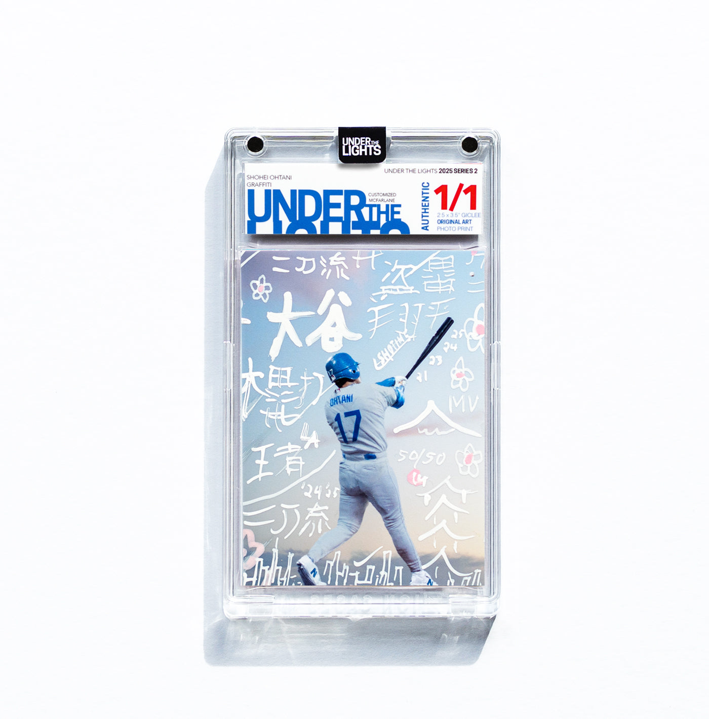 This piece features a photographic print of a Shohei Ohtani customized McFarlane figurine. The graffiti markings are painted on with a white acrylic paint pen. The piece features Kanji and Katakana words, and Japanese influences to pay homage to his home country.