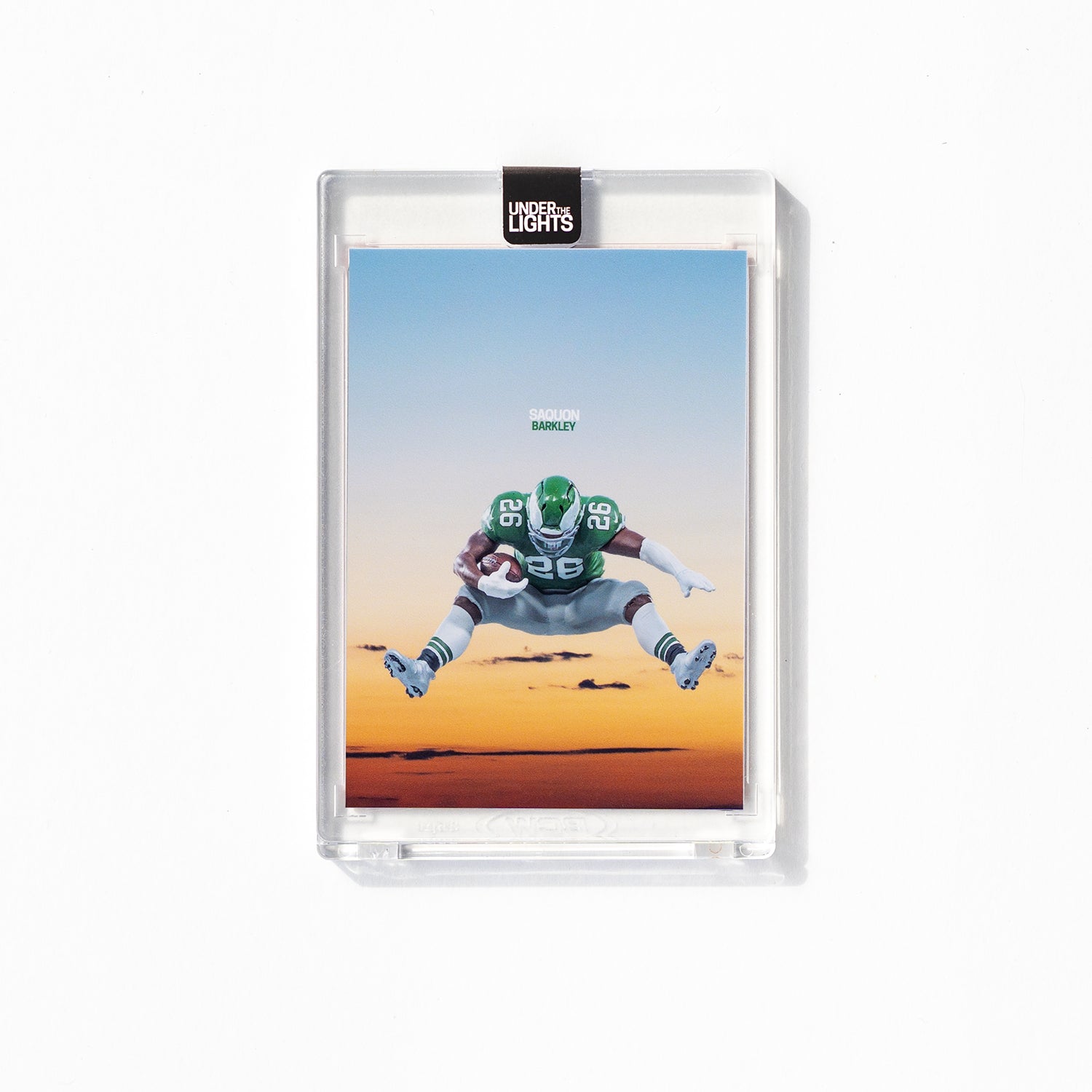 2025 Under the Lights Original Art Card of a Saquon Barkley figurine. This piece reimagines Saquon's reverse hurdle from 2024.