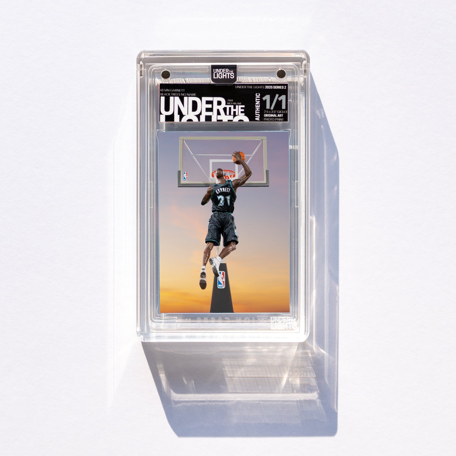2025 Under the Lights Original Art Card of a Kevin Garnett figurine playing under the lights wearing the Wolves Classic Black Trees uniforms.