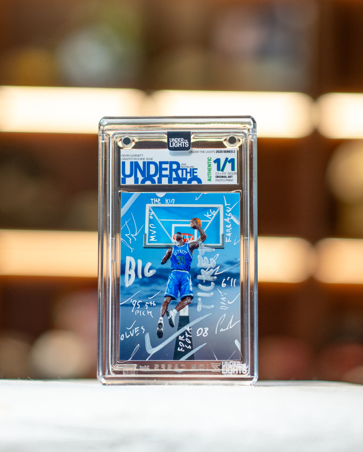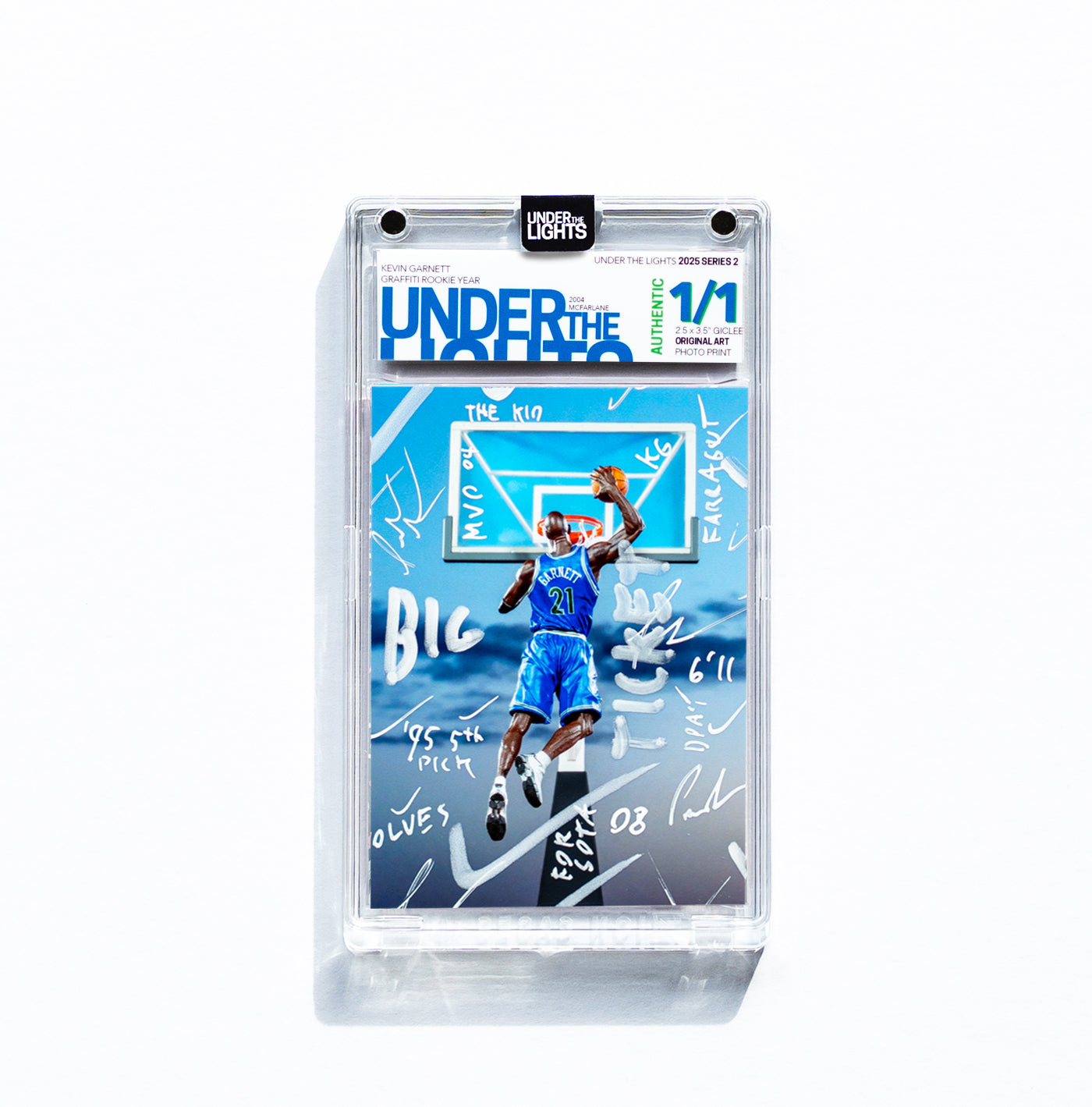 This piece features a photographic print of a Kevin Garnett figurine figurine outside under the lights. The graffiti markings are painted on with a white acrylic paint pen and are meant to highlight the contrast of KG's greatness and the unseen grit and grind behind it. Artwork by Paul Schlossman.
